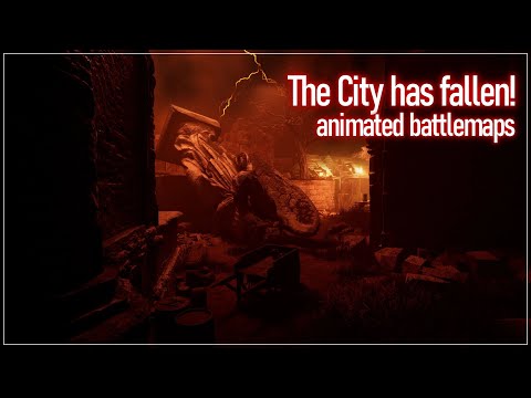 Ruined streets, burning rooftops, and lightning-split skies — City Has Fallen plunges your players into the aftermath of a devastating siege. With animated and static maps in multiple lighting variants, this pack is perfect for climactic battles, desperate escapes, or grim flashbacks. Use narrow alleys for ambushes, shattered plazas for boss fights, and POV illustrations to heighten drama. A cinematic setting for tales of ruin, vengeance, and survival.