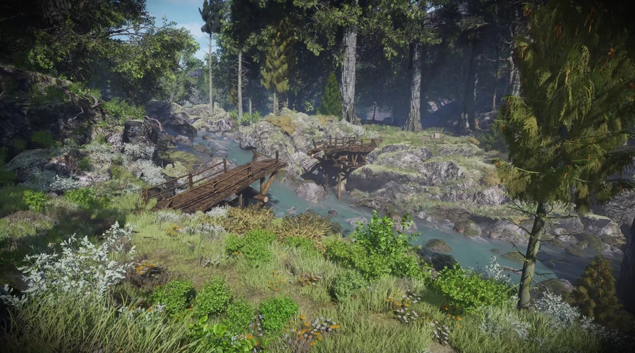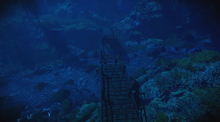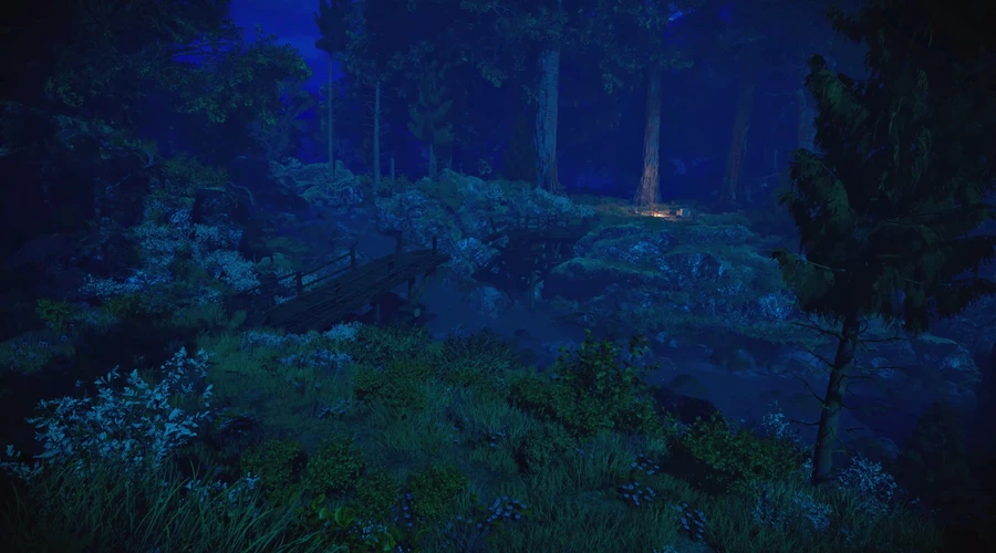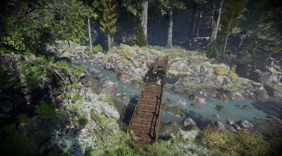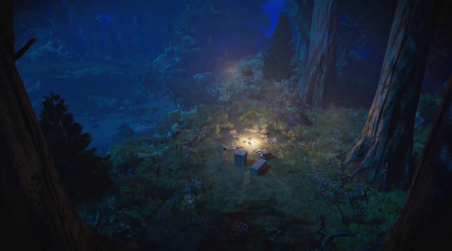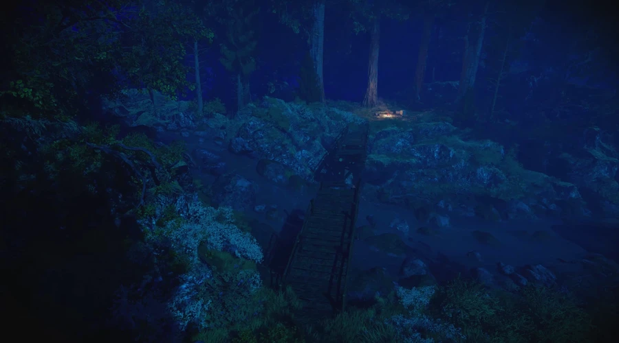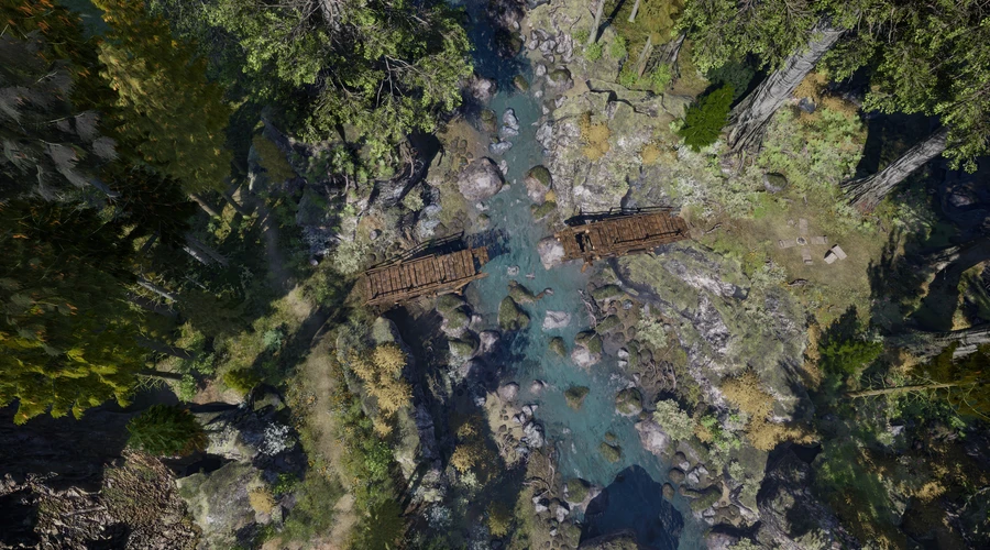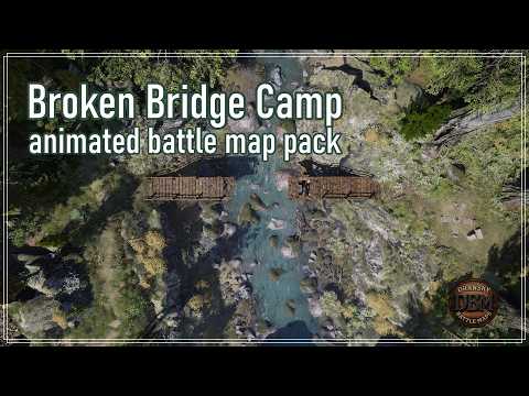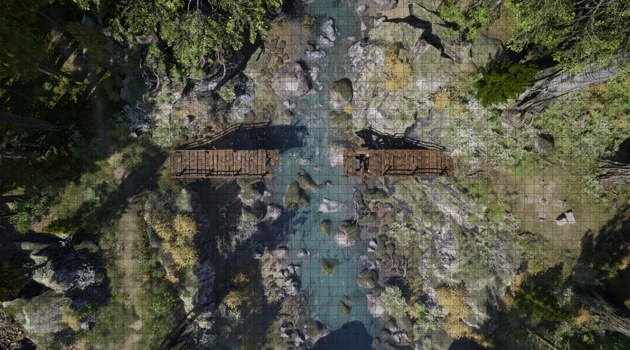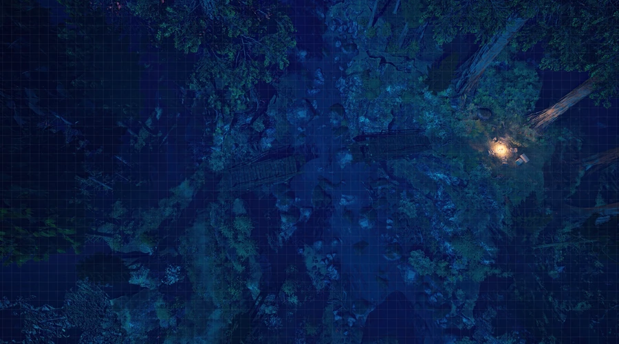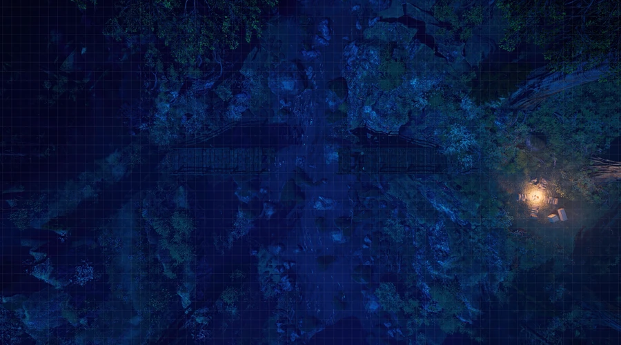 "Broken Bridge Camp" invites adventurers into a tranquil yet precarious forest clearing where a shattered wooden bridge arches over a rushing, rocky stream. The scene is rich with foliage and scattered stones, centering around a modest campfire surrounded by weathered crates, suggesting a temporary refuge or ambush point. This battlemap is ideal for tense encounters involving river crossings, ambushes, or cautious exploration under the watchful canopy of ancient trees, with dynamic lighting to c